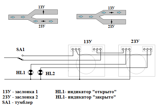 Две заслонки могут использоваться для перенаправления потока воздуха. Одним переключателем управляем двумя заслонками. Когда первая заслонка открыта, вторая закрыта. И наоборот.