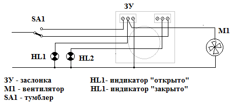 В самом простом случае для подключения заслонки требуется всего три провода и переключатель